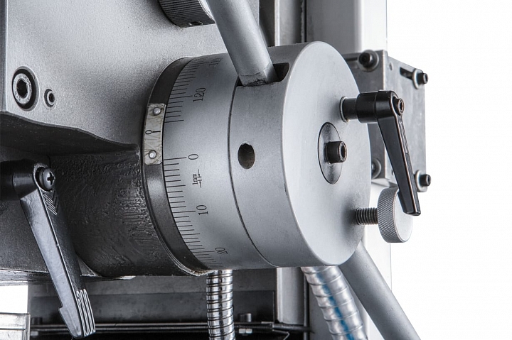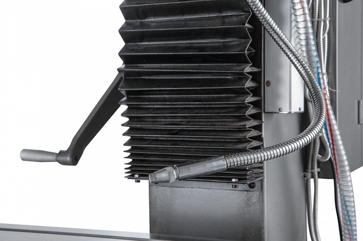 Конструкция станка имеет дополнительно устройство цифровой индикации (УЦИ) по всем трем осям X, Y, Z, позволяющее устанавливать необходимые параметры обработки, осуществлять привязку инструментов и контролировать режимы работы станка с точностью в 5 микрон. Станок оснащен автоматической подачей пиноли шпинделя, имеет 3 скорости - 0,12; 0,18; 0,25 мм/об. Наличие микрометрической подачи, позволяет установить инструмент на необходимую глубину в ручном режиме. Максимальный вылет пиноли шпинделя составляет 120 мм. Для увеличения производительности и удобства обработки крупногабаритных деталей, станок дополнительно оснащен механизированным приводом по оси Z. На пульте управления есть переключатель перемещения фрезерной головы по вертикальной стойке вверх/вниз.