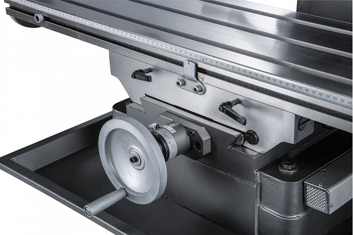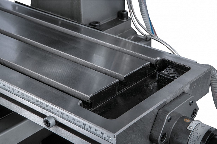 Модель JMD-50LPFD оснащена рабочим столом размером 1000 x 240мм, который перемещается по направляющим типа ласточкин хвост и имеет возможность перемещения по осям X, Y на величину 760мм и 190 мм соответственно. На столе имеется три Т-образных паза шириной 14 мм для закрепления деталей прихватами или установки тисков и других приспособлений. Опционально станок может быть дооснащен устройством автоматической подачи, которое устанавливается с левой стороны рабочего стола и позволяет осуществлять подачу по продольной оси в автоматическом режиме, улучшая качество получаемой поверхности и увеличивая производительность изготовления деталей. Также устройство имеет функцию ускоренного перемещения рабочего стола для сокращения времени подвода инструмента к детали и его отведения, для удобной установки/снятия обрабатываемой детали.