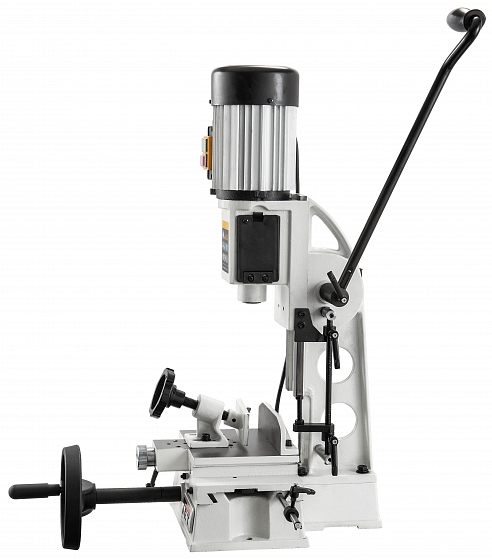 Подача сверла-резца производится длинной рукояткой, высоту которой можно настроить в зависимости от толщины заготовки и длины «долбяка». Вес подвижной части компенсирует газовый упор.