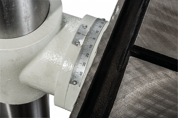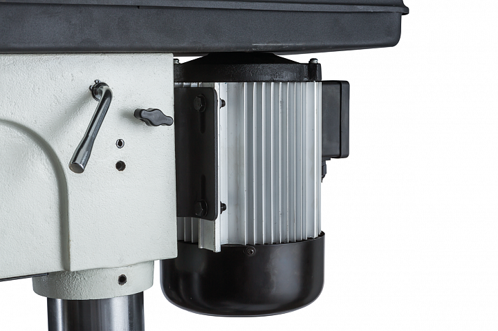 Шпиндель станка имеет конус МК-4, благодаря этому, ну и конечно двигателю мощностью 0,85кВт, станок способен сверлить отверстия в заготовках диаметром 32 мм. Не забывайте, что при этом на станке установлен асинхронный двигатель, подключается он к сети 380В и весь момент от двигателя передается через шкивы и ремни. Всего на станке 12 скоростей от 70 до 1650 об/мин. Обратите внимание именно 70 оборотов, это самая маленькая скорость в классе. Момент огромный и на маленьких оборотах сверлить, например, чугун можно до 35 мм.